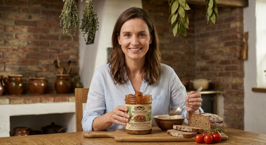 Skład: Mięso wieprzowe i wołowe (min. 70%), papryka czerwona, cebula, pomidory, czosnek, aromatyczne zioła, sól, pieprz. Bez konserwantów.